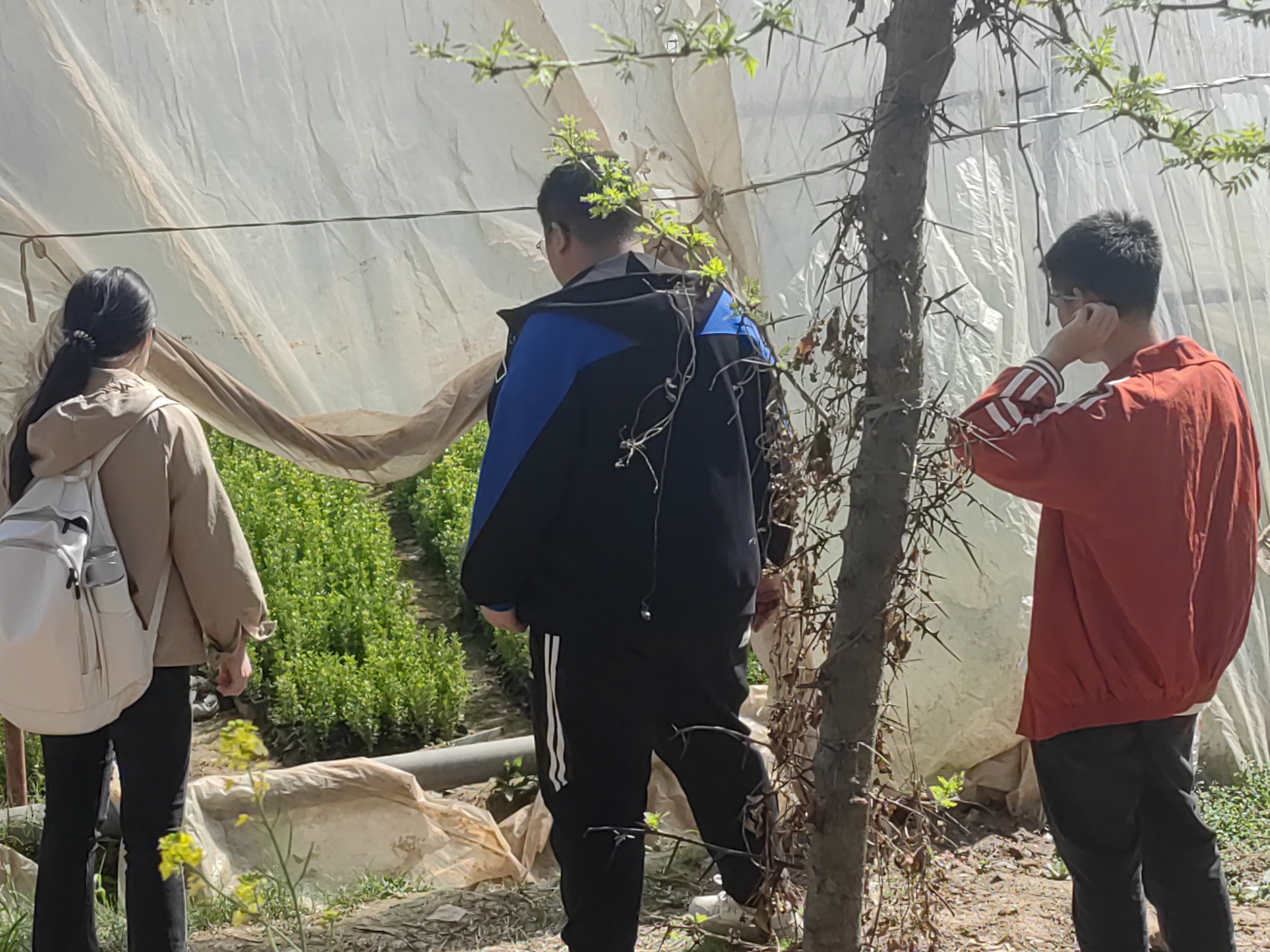 3月16日,队伍成员到达揉谷镇陵湾村参观经济种植地。精心种植的葡萄、树苗等农作物,虽还未结果,但在阳光的映衬下显得格外美丽。在大棚中,放眼望去,满园绿色,正如村庄发展态势,春意盎然,生机蓬勃。在观察植物时,成员注意到了农田有农药使用痕迹,经与村民交流,了解到村民在日常农作物种植时偶尔会使用化学农药除虫除草,但对化学农药的危害、使用注意事项等知之甚少。为此,队伍成员计划结合专业知识,面向村民开展农药知识宣传。