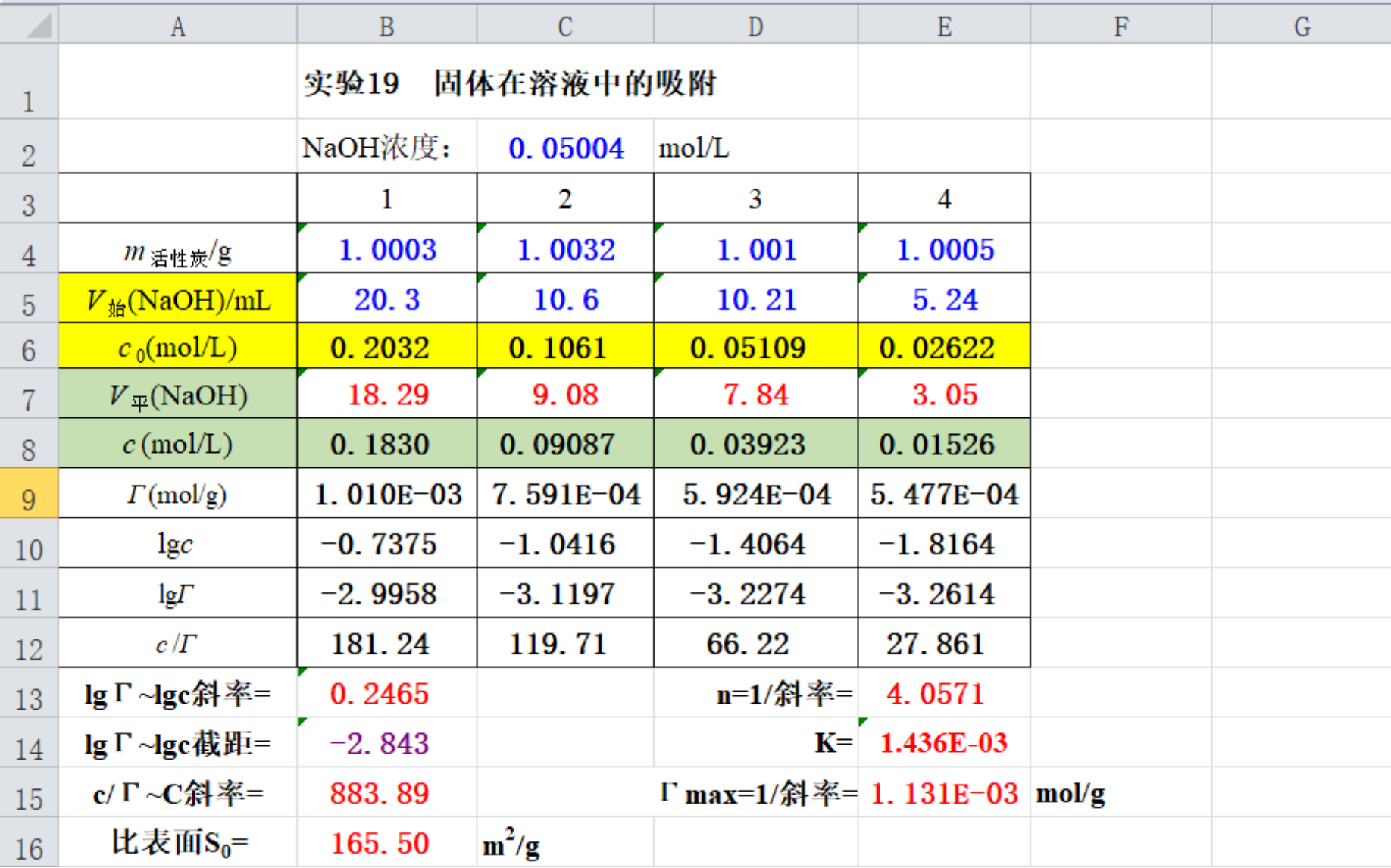 为了准确如实客观地评价学生实验结果的优劣,我多年来一直坚持“每一个学生每一次的实验数据处理结果都要亲自验算检验”的原则,为此我应用Excel软件制作了“实验数据批改模板”(见附件4),在批改实验报告时,我会将每个学生的原始数据输入此模板中,将系统生成的计算结果、图形与学生自己处理得到的结果、图形加以对照,很快就能发现其中存在的问题,包括计算上的错误,乃至复制、抄袭别的同学的结果和图表等态度上的问题,一旦发现,我会及时严肃地批评并责令其重新处理数据。