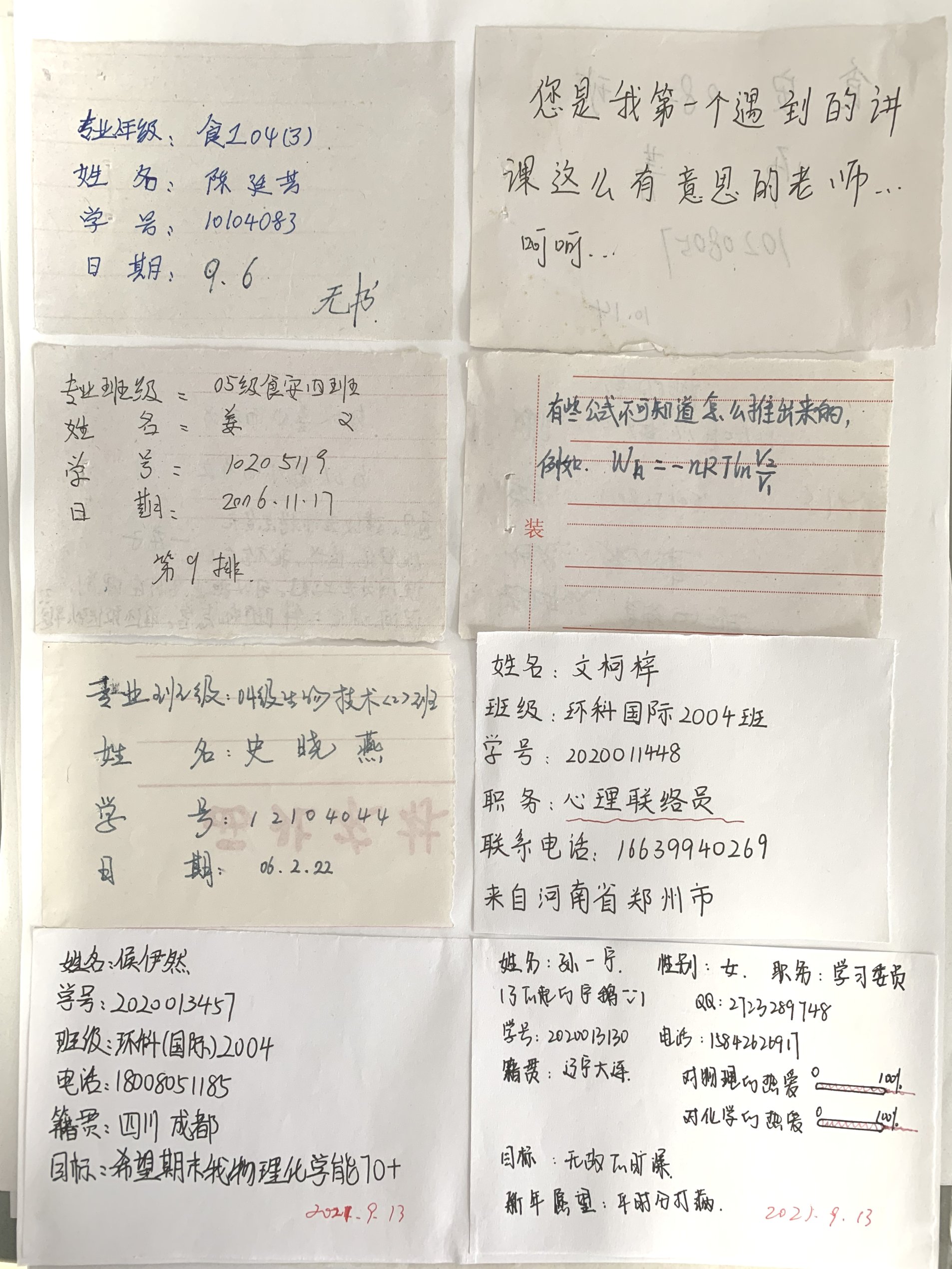 《物理化学》一开始讲的是化学热力学,这一部分理论性强、抽象概念多、公式多,比较枯燥,是整个课程的“拦路虎”,学生仅凭看书自学要想理解掌握会比较吃力。为了督促学生来听课,我会采取下课时“收名片”的方式进行课堂考勤,自己再利用课后时间对名片分班逐个统计出学生的出勤情况。这种方式,一是基本上不占用学生的课堂时间,二是想以“名片”的形式来不断地强化其“学生身份”,三是学生可以把学习或生活中遇到的疑问困惑写在名片背面,我对于一些出现频率高的共性问题会在课堂上集中解释。近年来,学校开发了在线签到考勤系统,但我有时还偶尔会采取收名片的方式来考勤。(见附件2)