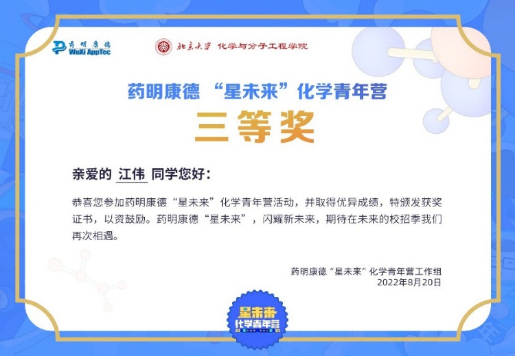 近日,六合论坛 谢卫青教授课题组2021级博士研究生江伟同学在药明康德举办的第五届“星未来”化学青年营活动中荣获三等奖。