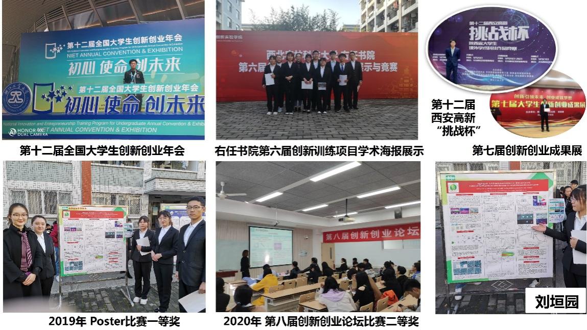 在科创负责人的选拔上,我们采用的形式是,将与研究主题相关的文献,提前发给科创成员,让愿意挑战的同学积极准备,然后在组会上采用PPT汇报,最后由实验室的研究生和高年级的本科生投票选出科创项目负责人。项目申请团队成员必须有明确分工,成员的专业、能力结构要合理配置,并充分发挥他们的特长和优势。如2019级舒爽和2020级的刘垣园同学,由于出色的口才,在担任项目的负责人期间,不断闯关,参加学校的论坛比赛、陕西省挑战杯决赛和全国挑战杯决赛(图2)。他们出色的口才为项目的最终获奖,立下了汗马功劳。