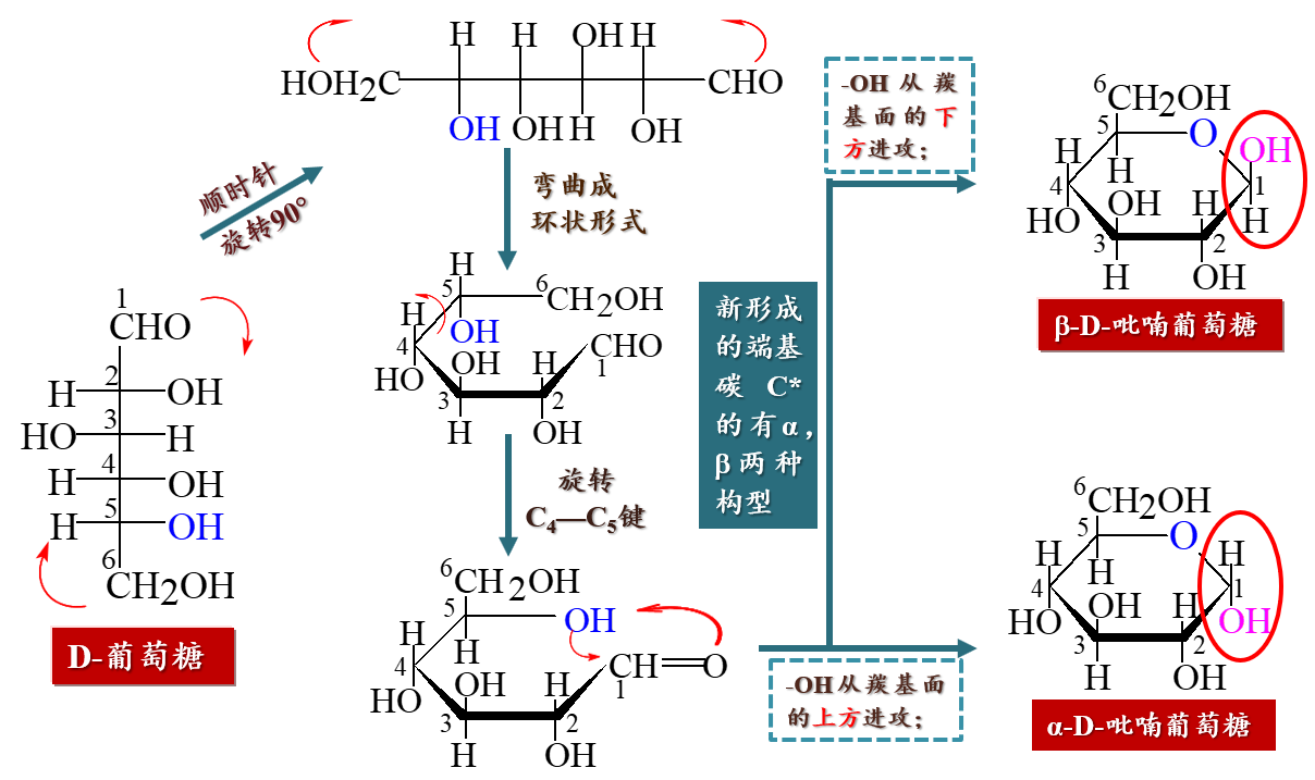【动画演示】【讲述】:如激活旧知的基础上,结合PPT动画重点讲述如何由糖(葡萄糖为例)的Fischer式转化为Haworth式(三部曲)。