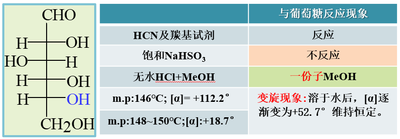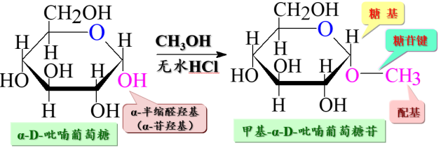 【对比】【讲述】:与前面醇-OH化学性质进行对比学习,强调半缩醛-OH的反应活性,并且所成的糖苷键具有特异性—特定构型的酶水解。