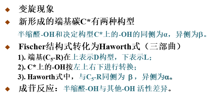 1.理解目标:了解糖的定义及其分类,理解糖的环状结构,变旋现象以及糖的苷化反应,并掌握由Fischer式到Haworth式转化(三部曲)。