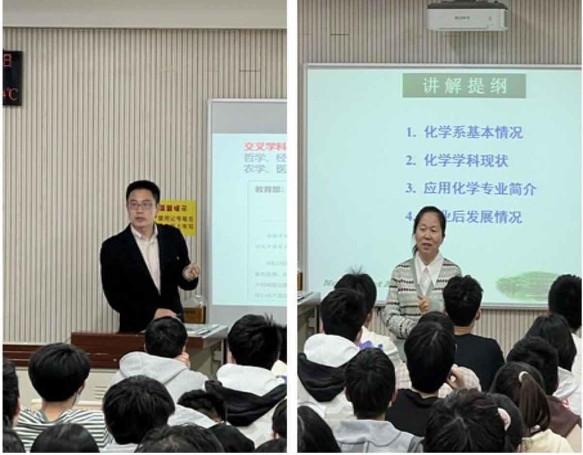 耿会玲老师围绕应用化学专业学科特色、师资力量、课程开设、培养方案、实践活动、科研成就及就业和升学前景进行了全面详细的介绍,并结合自身求学经历和工作实际,对于如何选择专业给学生提出了指导性的建议。汤江江老师在讲解化学生物学专业基本情况的同时,重点介绍了了本专业学科交叉融合的特色和优势,并联系社会热点和学生关注问题与现场学生进行了广泛交流,解答了学生关于专业分流选择上的疑虑,为专业选择提供了更多针对性的意见和建议。