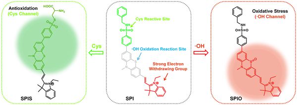 图1. 双位点荧光传感器对•OH和Cys的响应机制